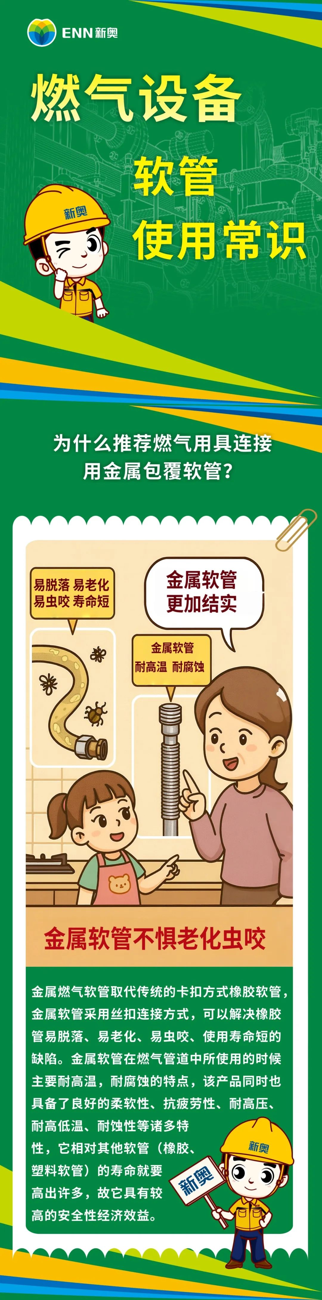 燃?xì)膺B接管為何強(qiáng)烈推薦金屬包覆軟管?它具有耐腐蝕、抗高溫、耐高壓、柔韌性強(qiáng)等特性,可以解決傳統(tǒng)膠管易脫落、老化、蟲咬、壽命短等痛點(diǎn),更加安全耐用!