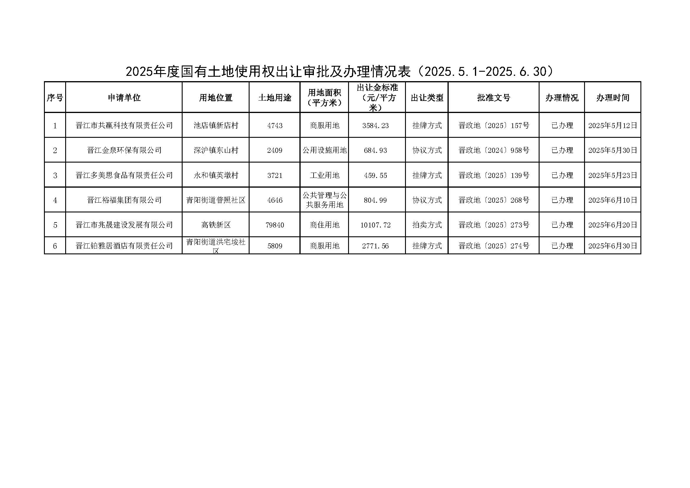 2025年度國有土地使用權出讓審批及辦理情況表(2025.5.1-2025.6.30)