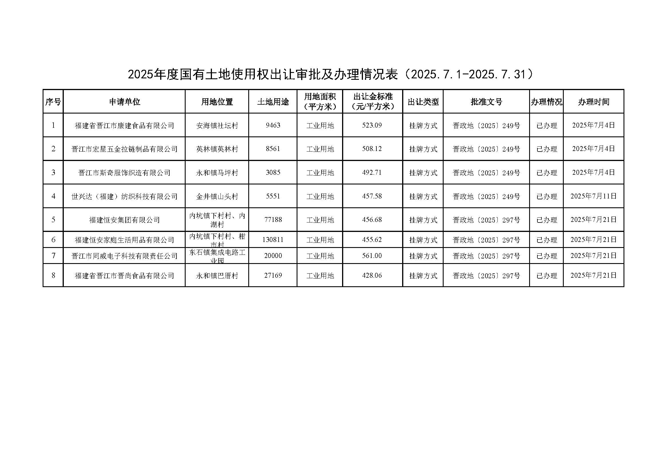 2025年度國有土地使用權出讓審批及辦理情況表(2025.7.1-2025.7.31)