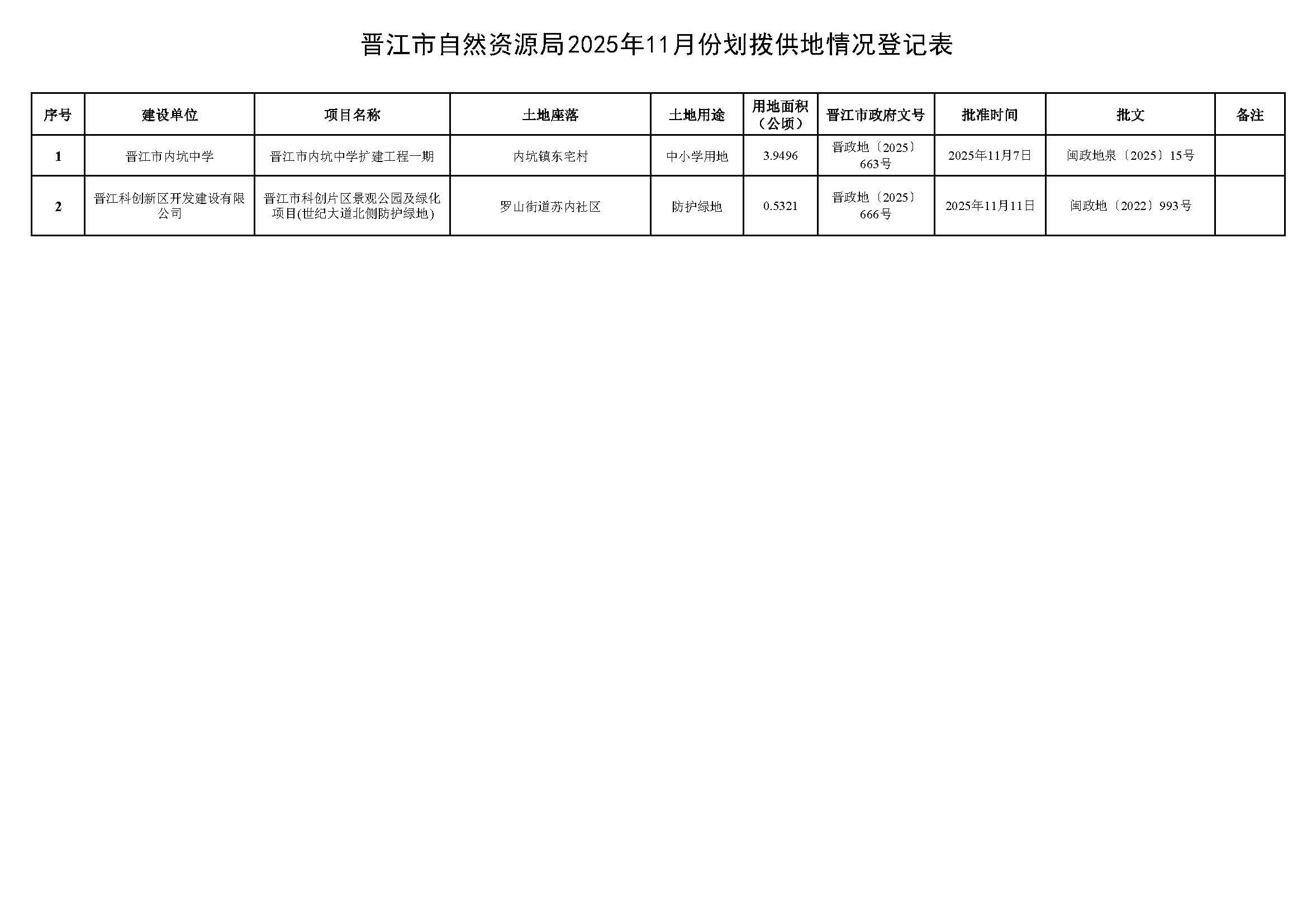 晉江市自然資源局2025年11月份劃撥供地情況登記表
