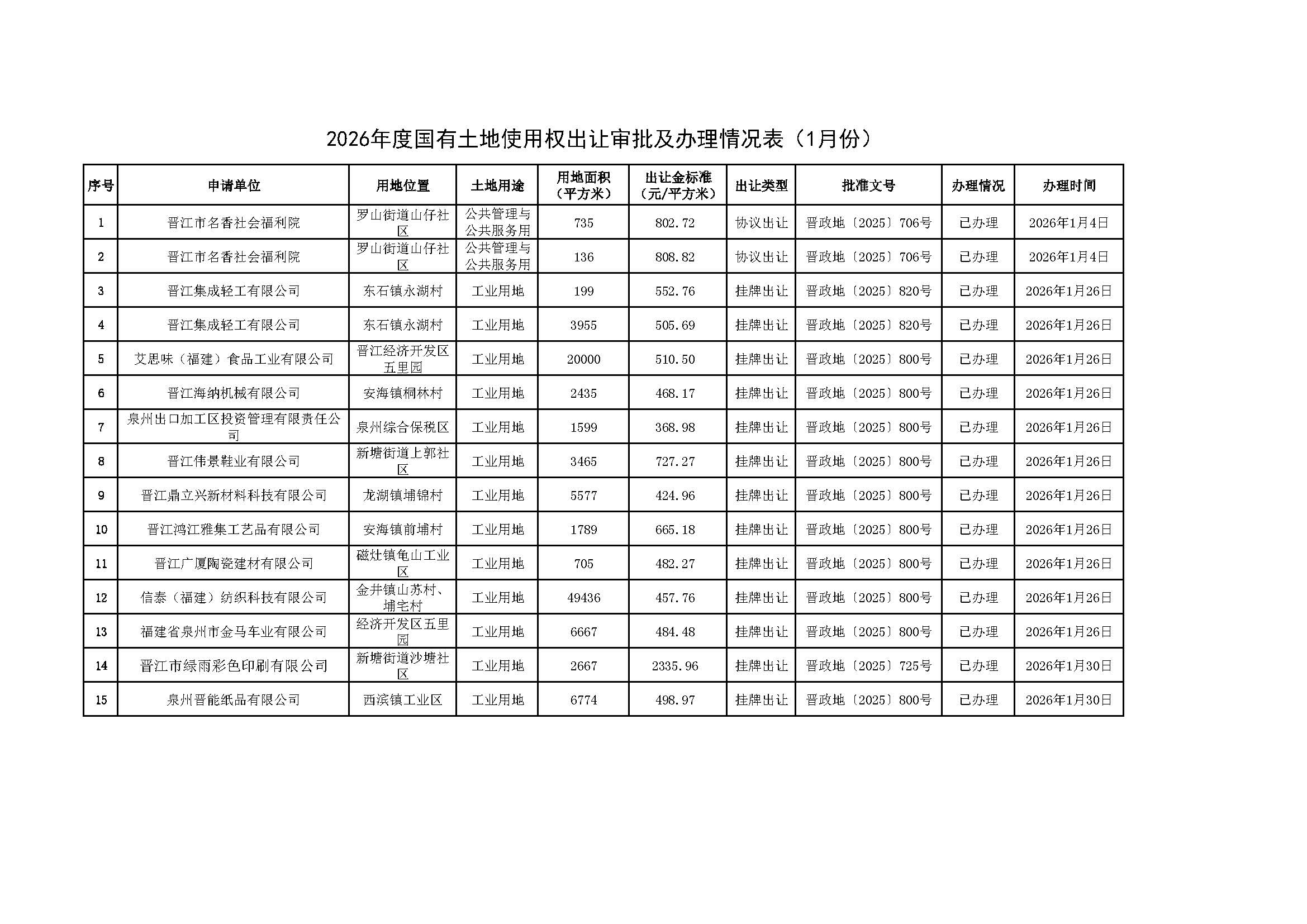 2026年度國(guó)有土地使用權(quán)出讓審批及辦理情況表(1月)