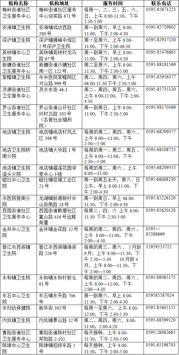 晉江市提供流感疫苗接種服務的基層醫療衛生機構名單