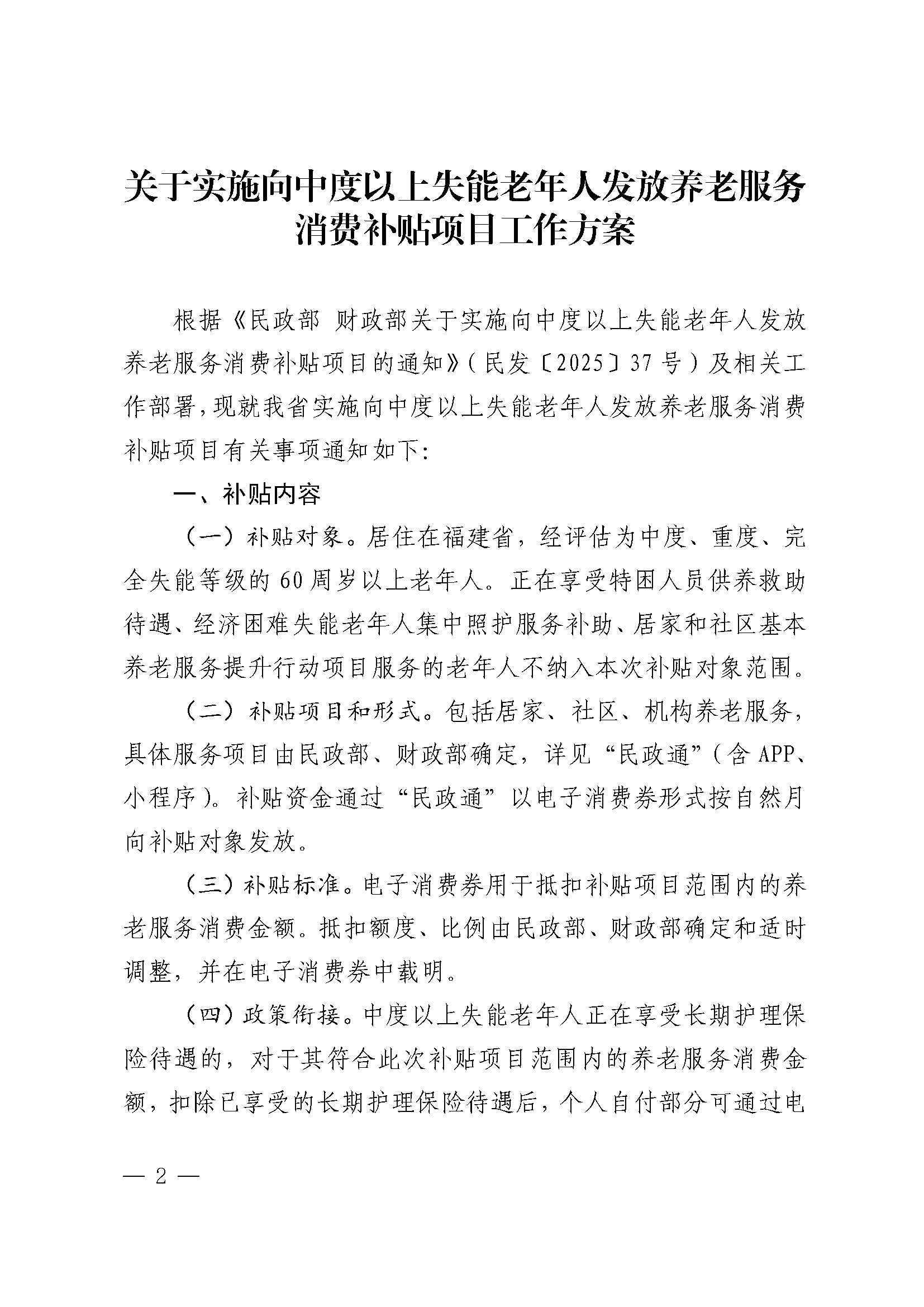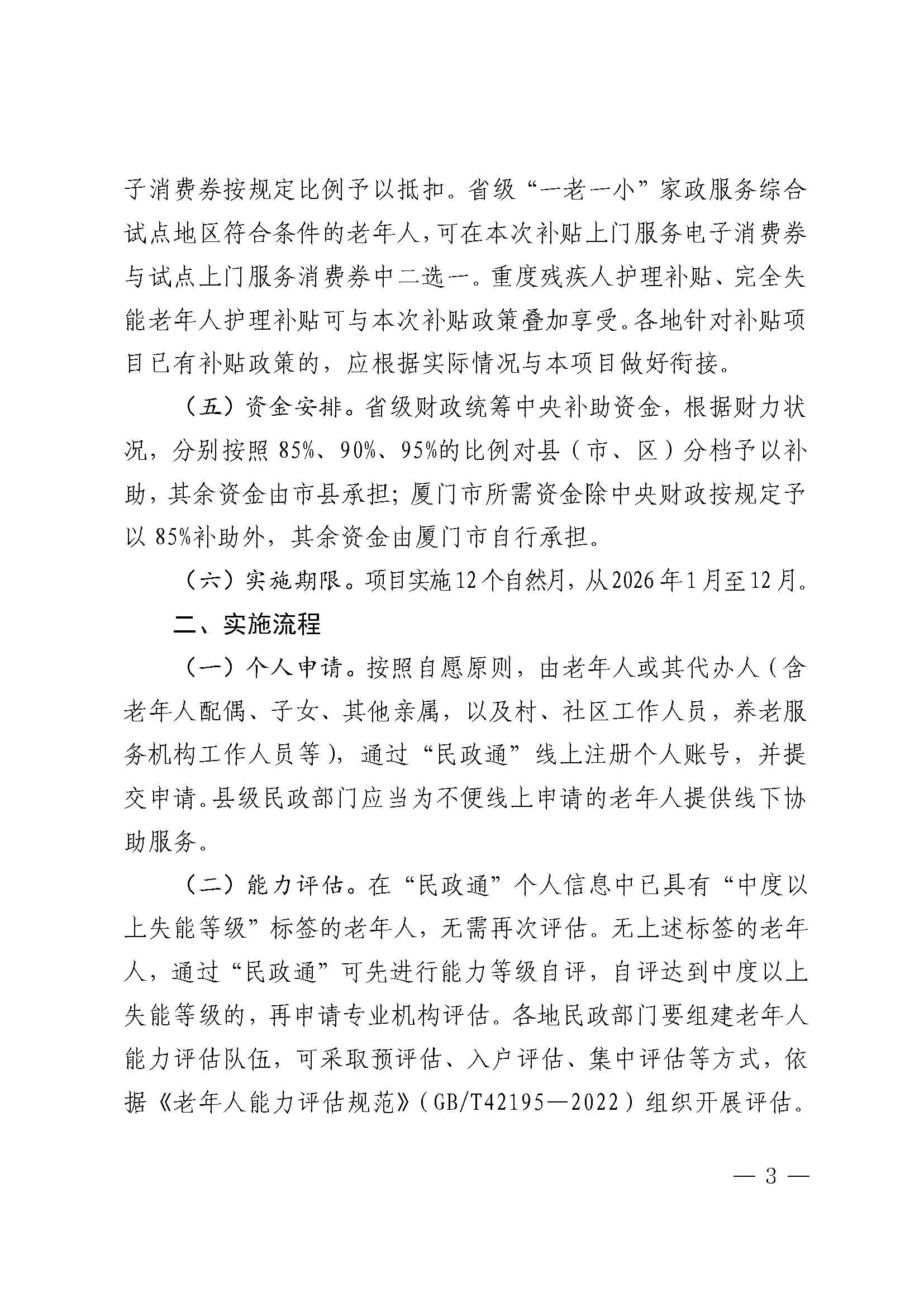 向中度以上失能老年人發放養老服務消費補貼工作,是深入貫徹落實積極應對人口老齡化國家戰略、健全養老服務體系、增進老年群體民生福祉的重要舉措。為切實推動此項政策落地生根、精準發力、惠及民生,現將《福建省民政廳 福建省財政廳印發〈關于實施向中度以上失能老年人發放養老服務消費補貼項目工作方案〉的通知》(閩民養老〔2026〕10號)轉發給你們。結合我市實際,現就有關工作要求進一步明確如下,請一并嚴格遵照執行、抓好落實。