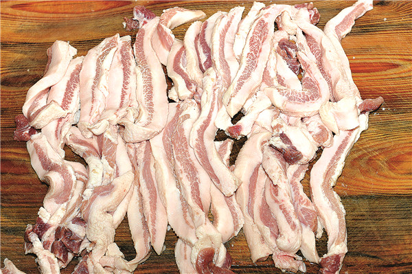 1.選用三層肉,剔掉肉皮,細切成一塊塊的小薄片;